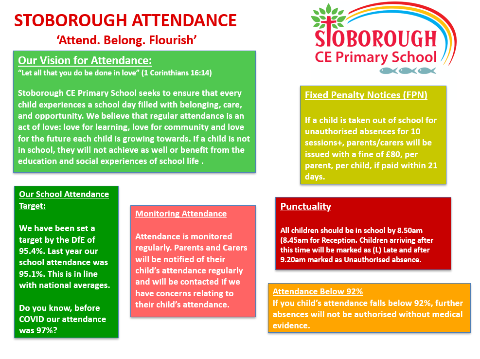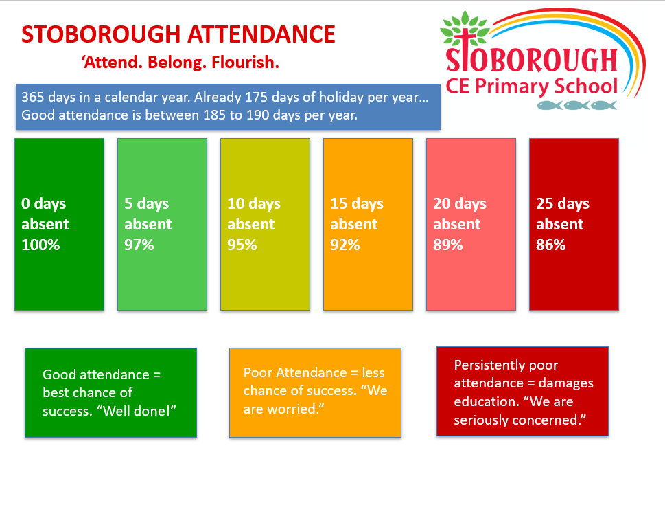 All children should aim for 100% attendance and a minimum of 96% attendance is expected. If attendance falls below this, it can have a significant impact on the number of lessons missed, which then impacts progress and achievement.